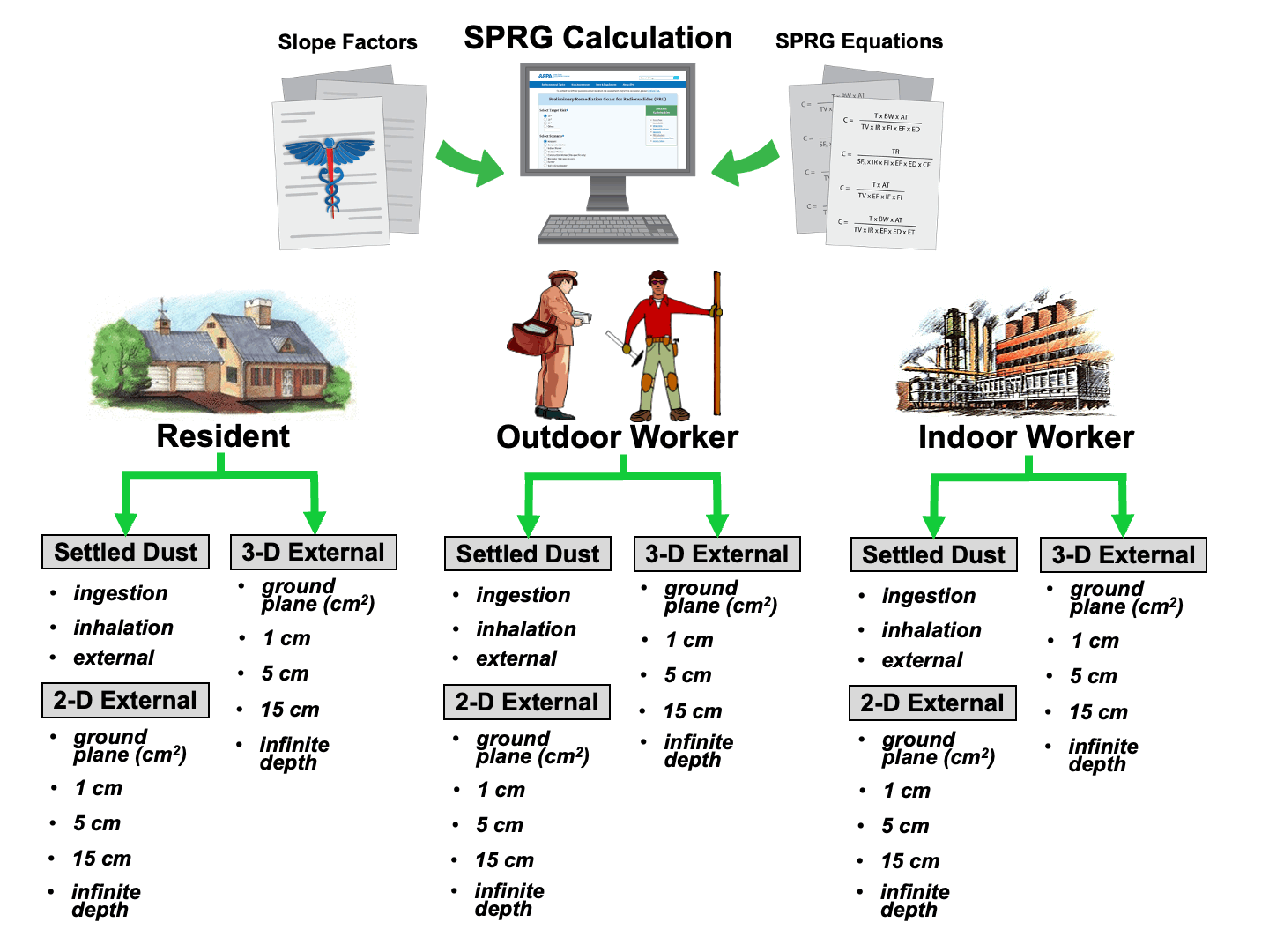 This tool presents recommended risk-based SPRGs calculated using default input parameters and the latest toxicity values. In addition, users are able to modify the input parameters to create site-specific SPRGs to meet the specific site needs, considering factors related to the underlying exposure scenarios, pathways, and routes. To learn more about the use of these recommended SPRGs, please see further guidance located in the "User's Guide", "What's New", 'FAQ", and "Download Area" links. Below is a general description of SPRG use involving radionuclides. The EPA has prepared a fact sheet for the general public that describes SPRG uses, SPRG calculator operation, and land uses available for assessment. Additionally, this fact sheet describes the SPRG and SDCC calculators in greater detail for EPA staff. The OSWER Directive, Superfund Radiation Risk Assessment: A Community Toolkit was also developed by the EPA to help the public understand more about the risk assessment process used at Superfund sites with radioactive contamination.